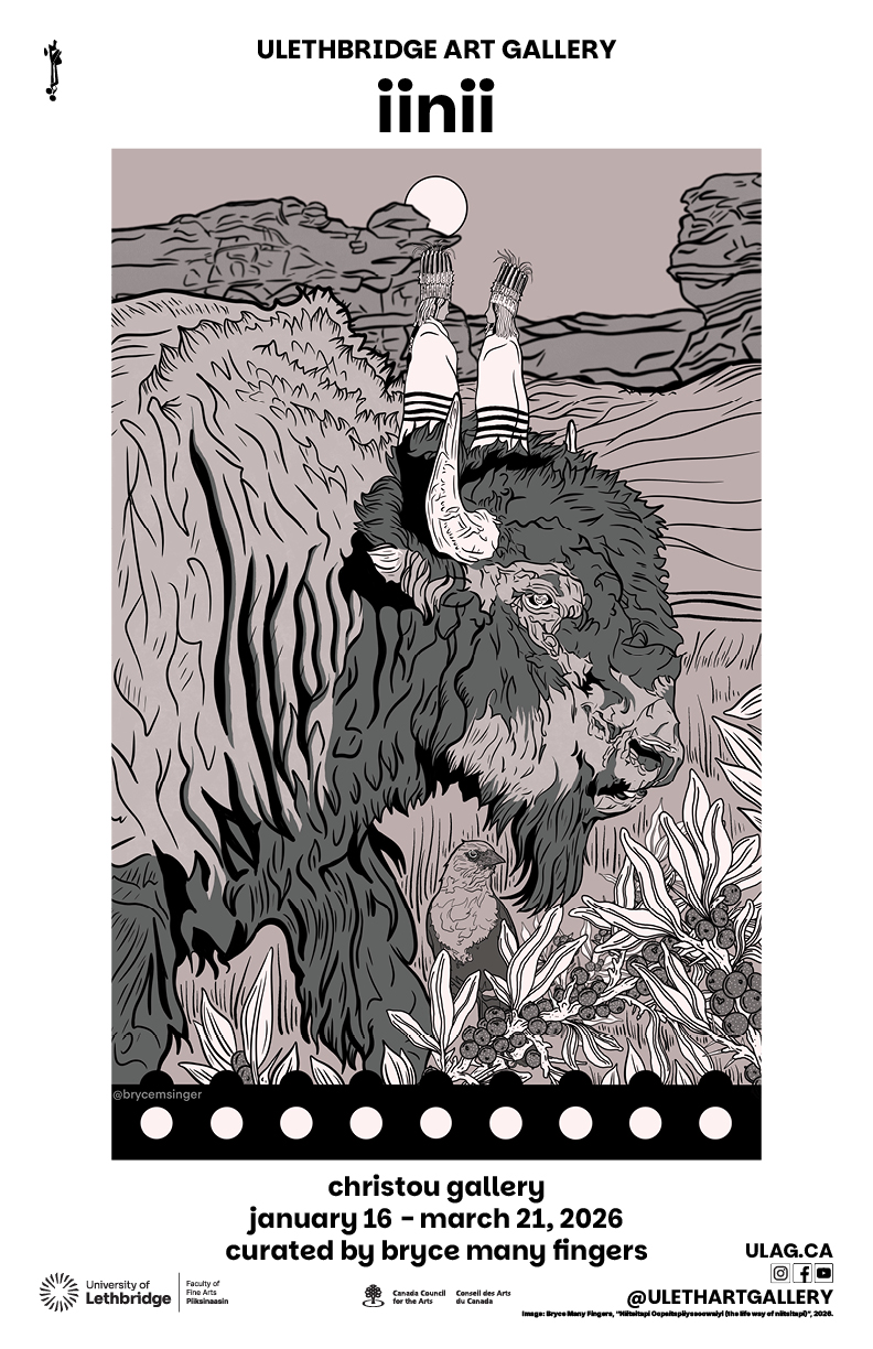 This exhibition highlights artworks that are reminiscent of Bison from eras of the past and present. “Iinii,” being the Blackfoot word for Bison, offers a glimpse into some of the artworks of Bison found in the University of Lethbridge’s collection. Through the lens of multiple artists throughout Canada from both Indigenous and Non-Indigenous backgrounds, the images of bison all appear as one with the landscape where they have been represented through various mediums such as documentation, photography, illustrations, paintings, and storytelling.