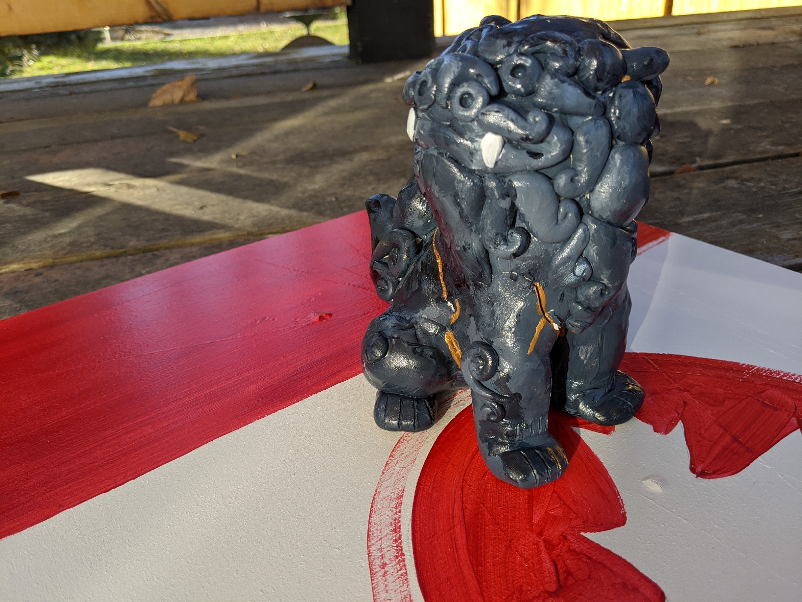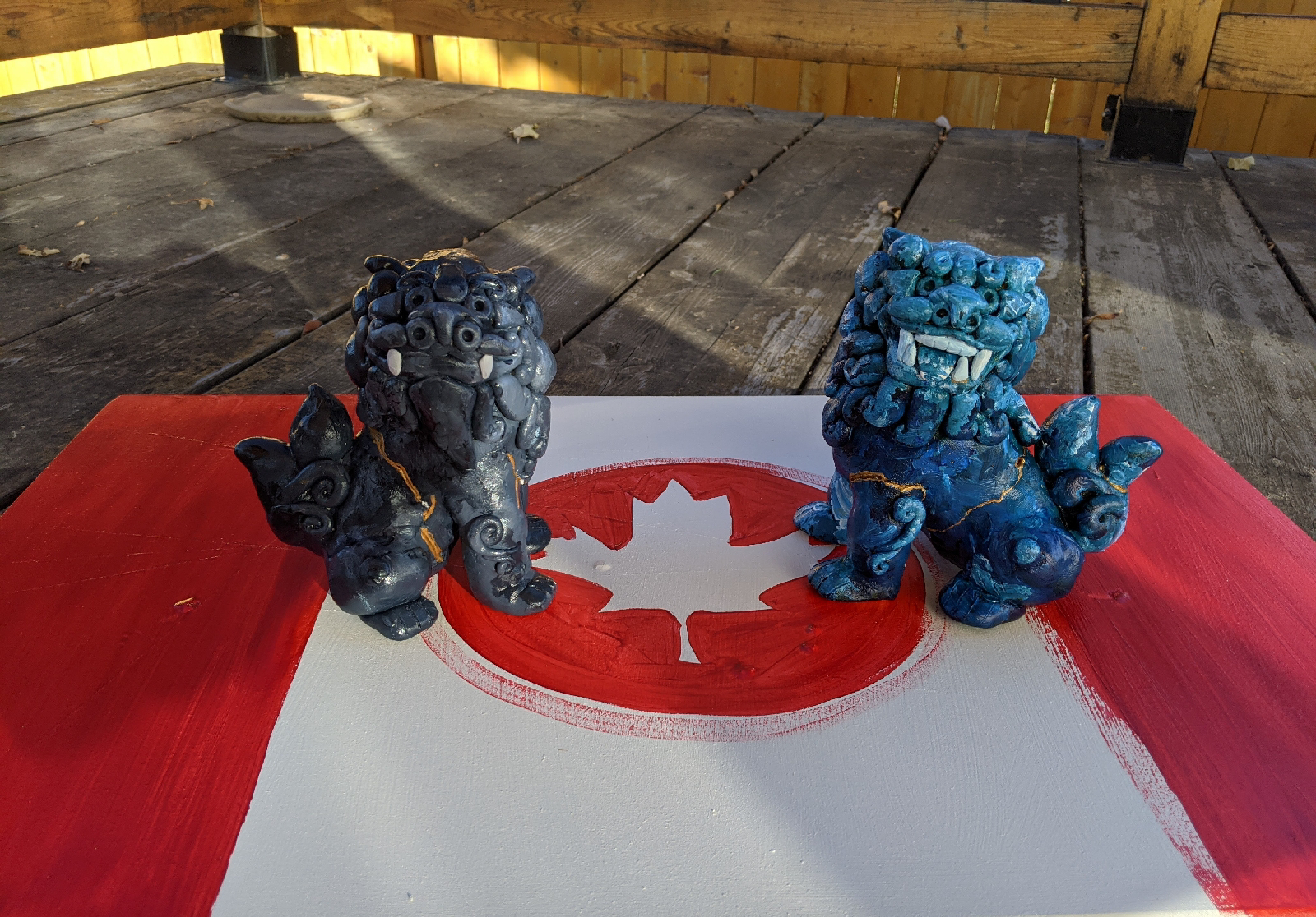 Broken, but Mending is an interpretation of my family and their struggle in Canada, my identity, and my own personal demons. The idea behind this piece takes a part of my family’s Okinawan culture: protecting the home and the person. The shisa (lion dogs) are the two statues on the platform, which are cultural representations of guardians of the home in Okinawa, Japan. One has its mouth open to ward off evil spirits, one has its mouth closed to keep good spirits in. These statues are sitting upon a combination of the Japanese and Canadian flag to represent the protection of the lands united, a place and a culture we call home.